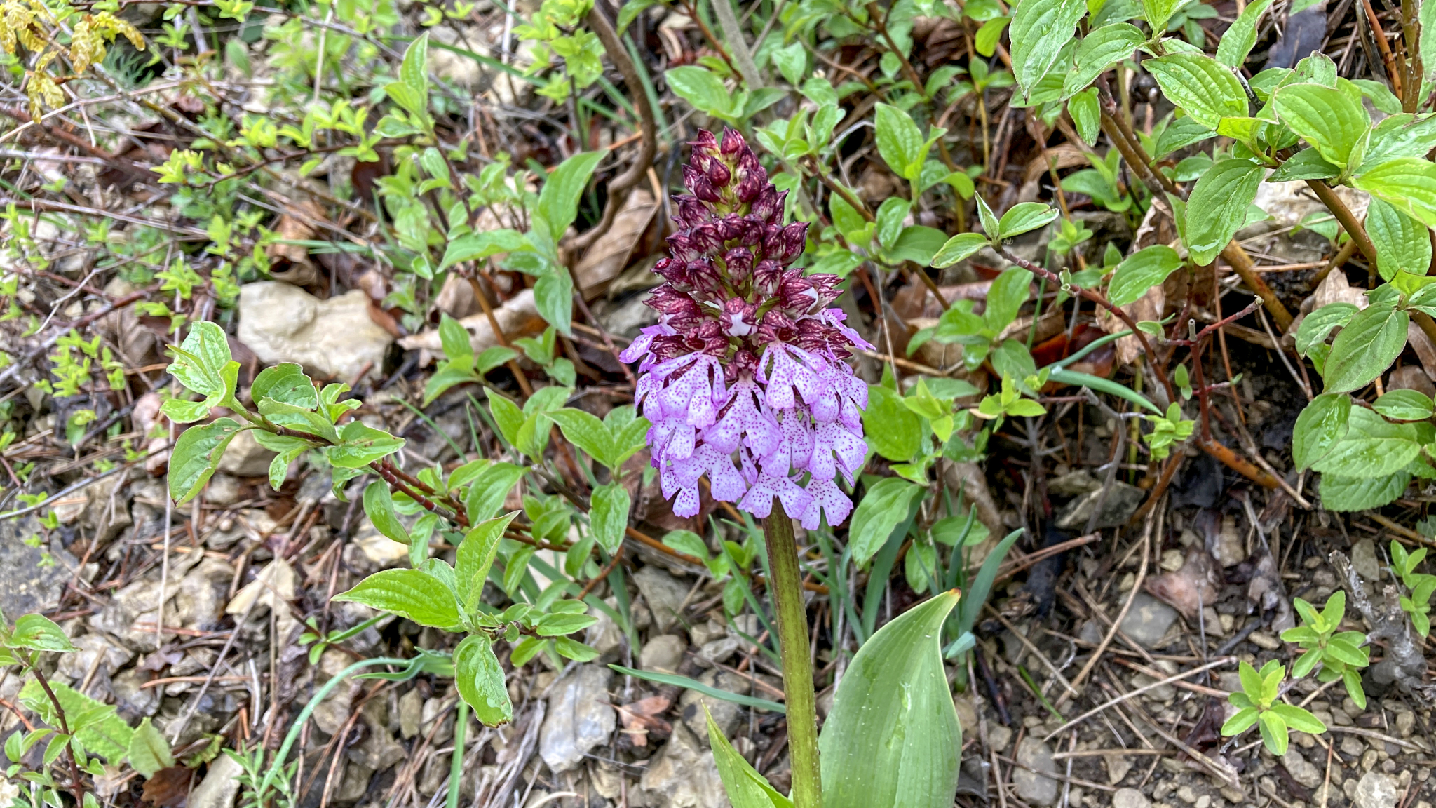 Von hier geht es, wieder etwas vom Originalweg abweichend, nach hinten in ein tief eingeschnittenes Tal hinein. Der Pfad ist steil und vom Regen aufgeweicht und wird durch einige ausgesetzte Stellen etwas abenteuerlich, aber wir kommen ohne größere Probleme unten an. Das ganze Tal ist mit Buchen dicht bewachsen, am Grund fließt ein kleiner Bach und wir gehen durch ein Blumenmeer. Bekannt ist das Tal für Märzenbecher, aber heute scheint alles, was noch im Frühling blühen wollte, heraus gekommen zu sein. Zwischen den Blüten sieht man vereinzelt den Gefleckten Aaronstab herausstehen, den wir lieber nicht anrühren.