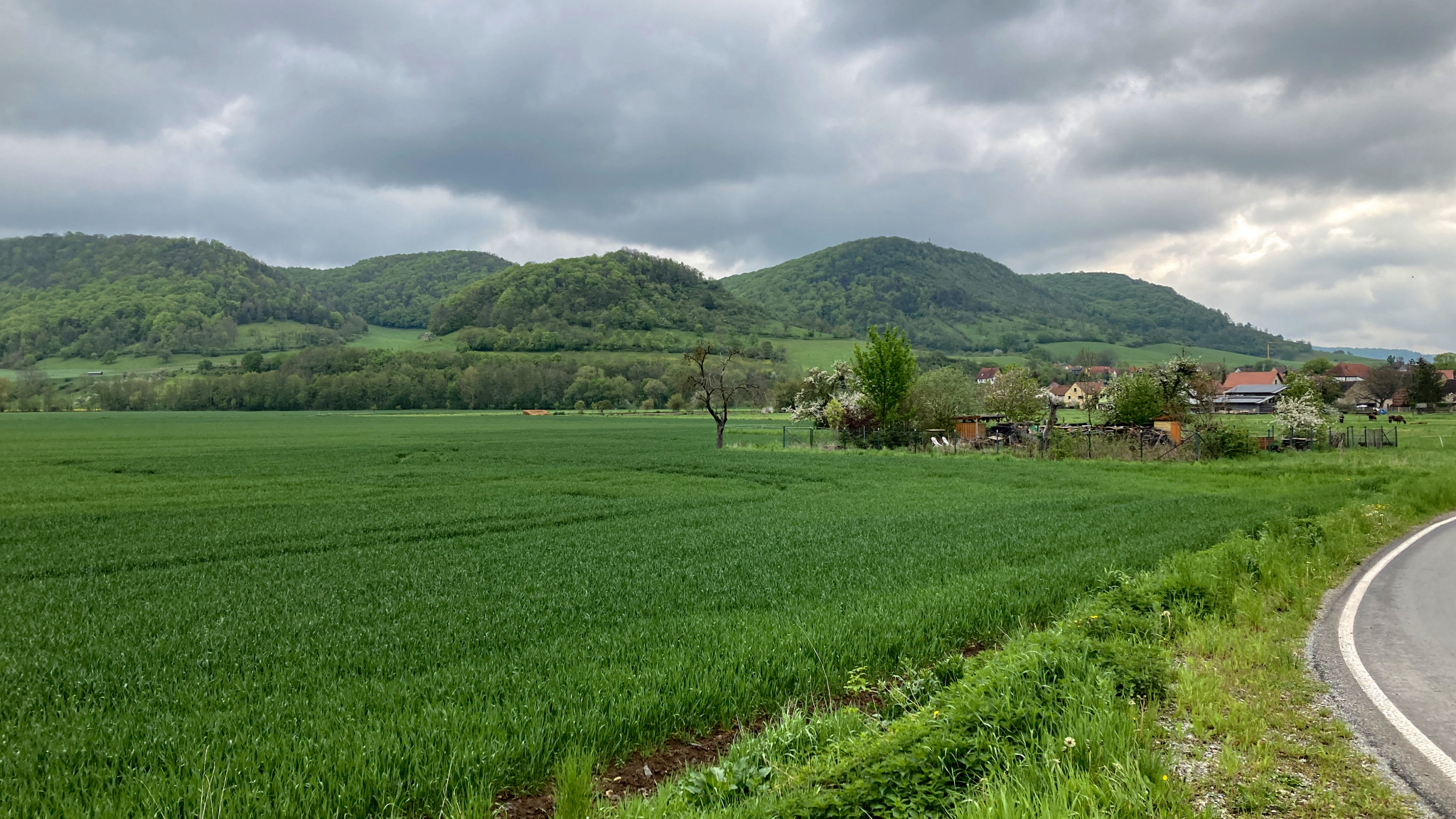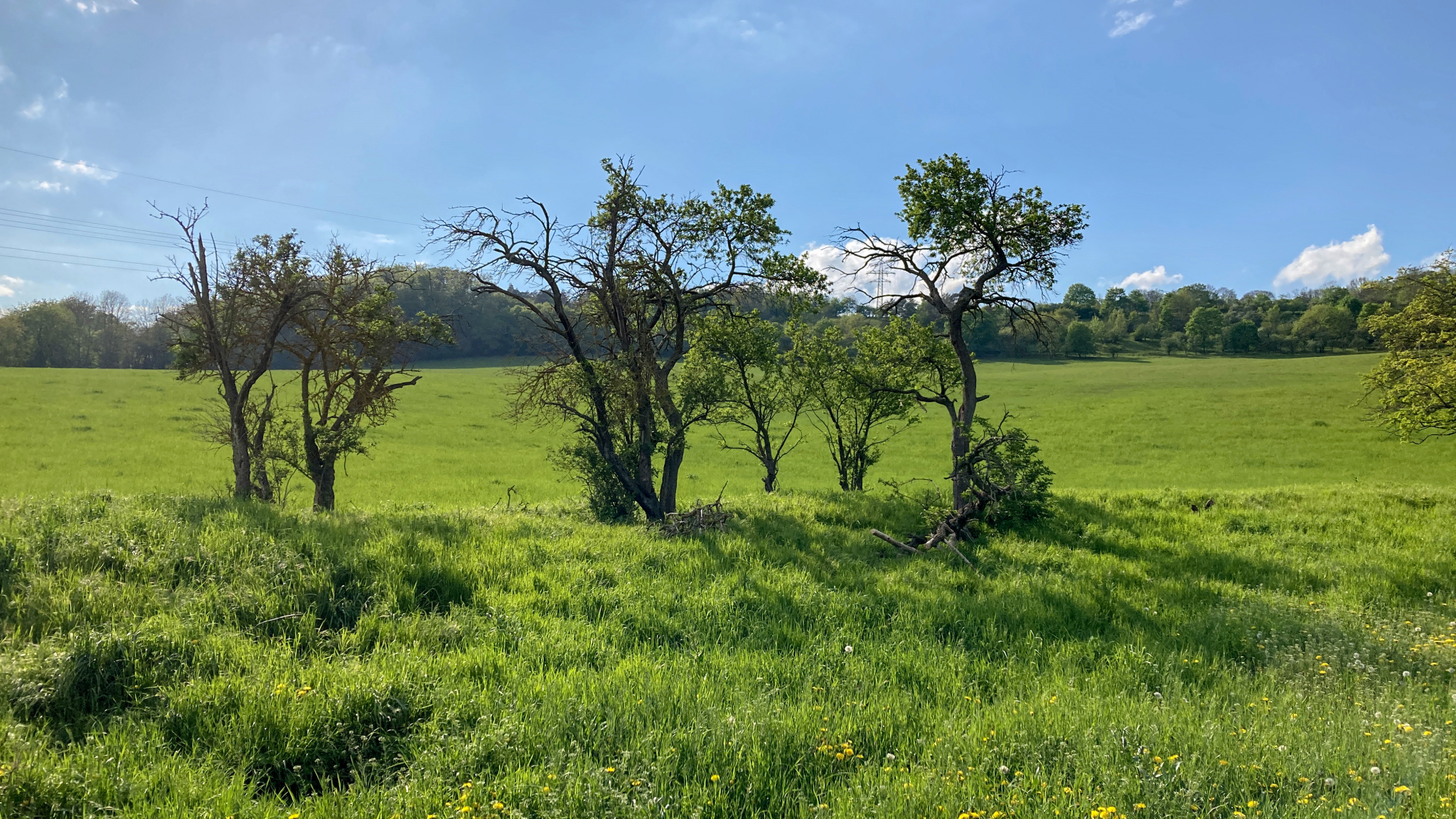 In den Bergen vor uns sieht man die Kunitzburg und auch schon den ersten Teil der heutigen Etappe. Wir wandern die Straße entlang durch die Orte Golmsdorf und Beutnitz und sehen in der Ferne die Felsen der Zietschkuppe, vor denen wir dann aufsteigen, jetzt wieder auf dem offiziellen Wanderweg. Der Weg nach oben führt durch Streuobstwiesen mit blühenden Obstbäumen und an der Pfingstrosenwiese vorbei. Später auf der Hochebene passieren wir das Gelände der Thüringer Landessternwarte und gehen dann weiter nach Tautenburg. Dort gibt es eine sehr schöne Burgruine und eine überraschend große Kirche. Beide lassen wir heute links liegen und wandern stattdessen weiter durch den Wald in Richtung Dorndorf.