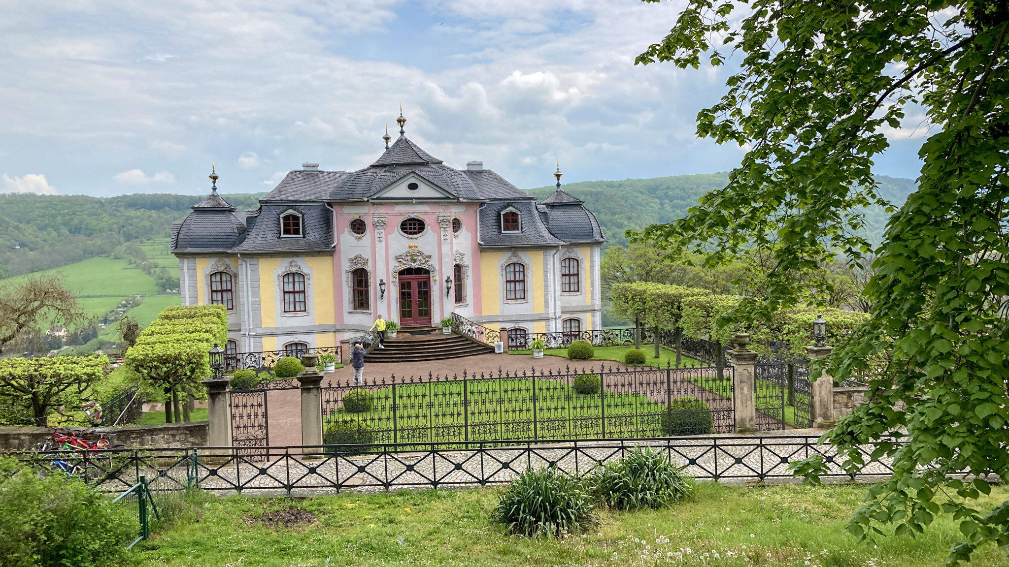 Der Weg geht jetzt parallel zur Saale und bietet sehr schöne Blicke ins Saaletal. Am Wegrand entdecken wir zwischen Frühlingsblumen immer wieder Orchideen. Nach dem Abstieg nach Dorndorf finden wir dort einen Bäcker, bei dem wir ein wunderbares Stück Thüringer Blechkuchen kaufen können. Hier müssen wir die Saale überqueren, um auf der anderen Seite wieder zurück in Richtung Jena zu kommen. Die erst 2020 sanierte Carl-Alexander-Brücke bringt uns sicher über den Fluß. Es geht nun wieder steil bergan bis wir nach Dornburg kommen. Hier führt uns der Weg direkt an den Dornburger Schlössern vorbei, die direkt an die Felsenhänge gebaut wurden.