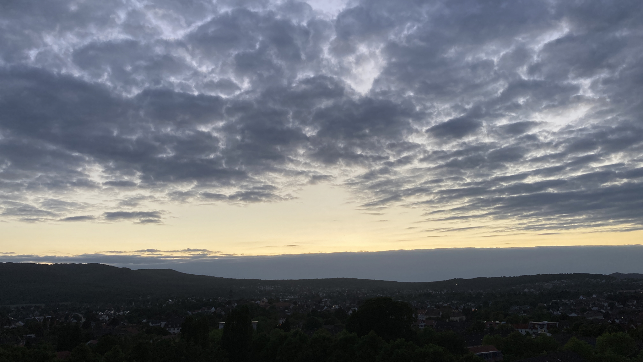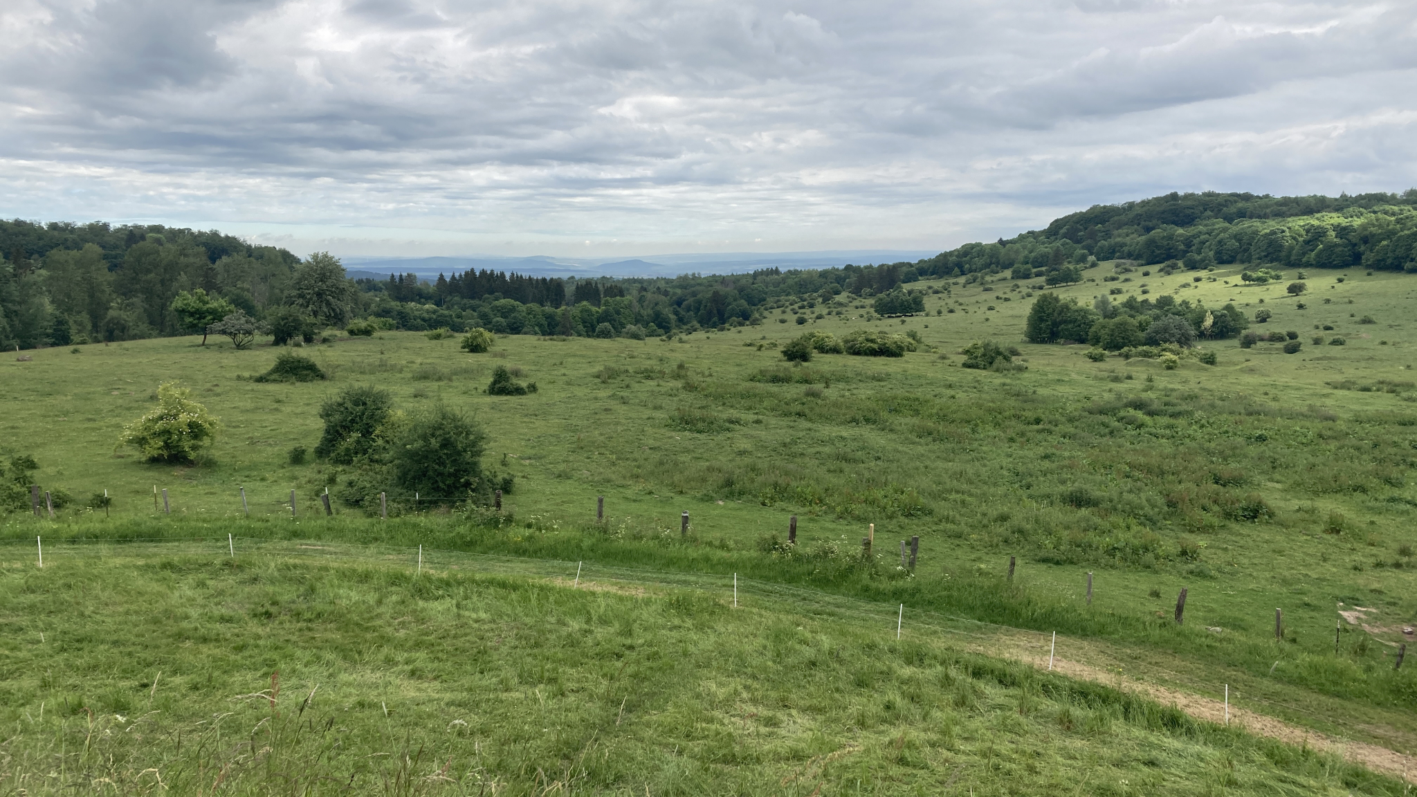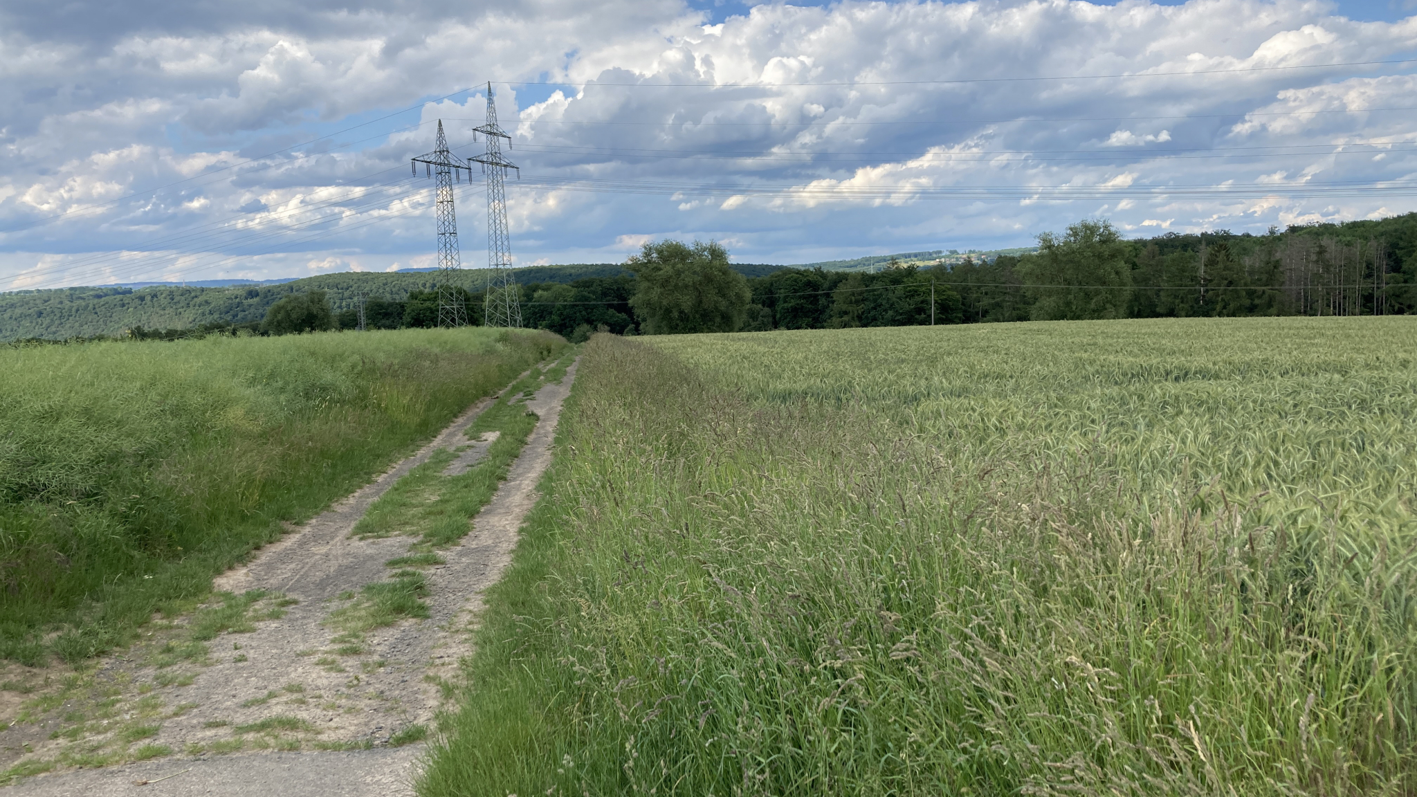 Über Feldwege geht es nun auf den Stadteil Wolfsanger-Hasenhecke zu. Der liegt auf einem Berg und das bedeutet die letzten 50m Anstieg für uns auf der heutigen Tour. Unterwegs kommt aus einem Gartenhäuschen laute Musik. Eine Band probiert sich mit Klassikern wie "Smoke On the Water". Die Sonne ist heraus gekommen und zeigt uns, was sie im Juni zu leisten vermag, auch noch nach 17:00 Uhr. Damit ist der Aufstieg über offene Felder wieder schweißtreibend und er reduziert unsere Wasservorräte erheblich. Oben geht es weiter durch Felder, auf denen Gerste und Weizen wächst und wir haben noch einmal herrliche Ausblicke über die Landschaft.