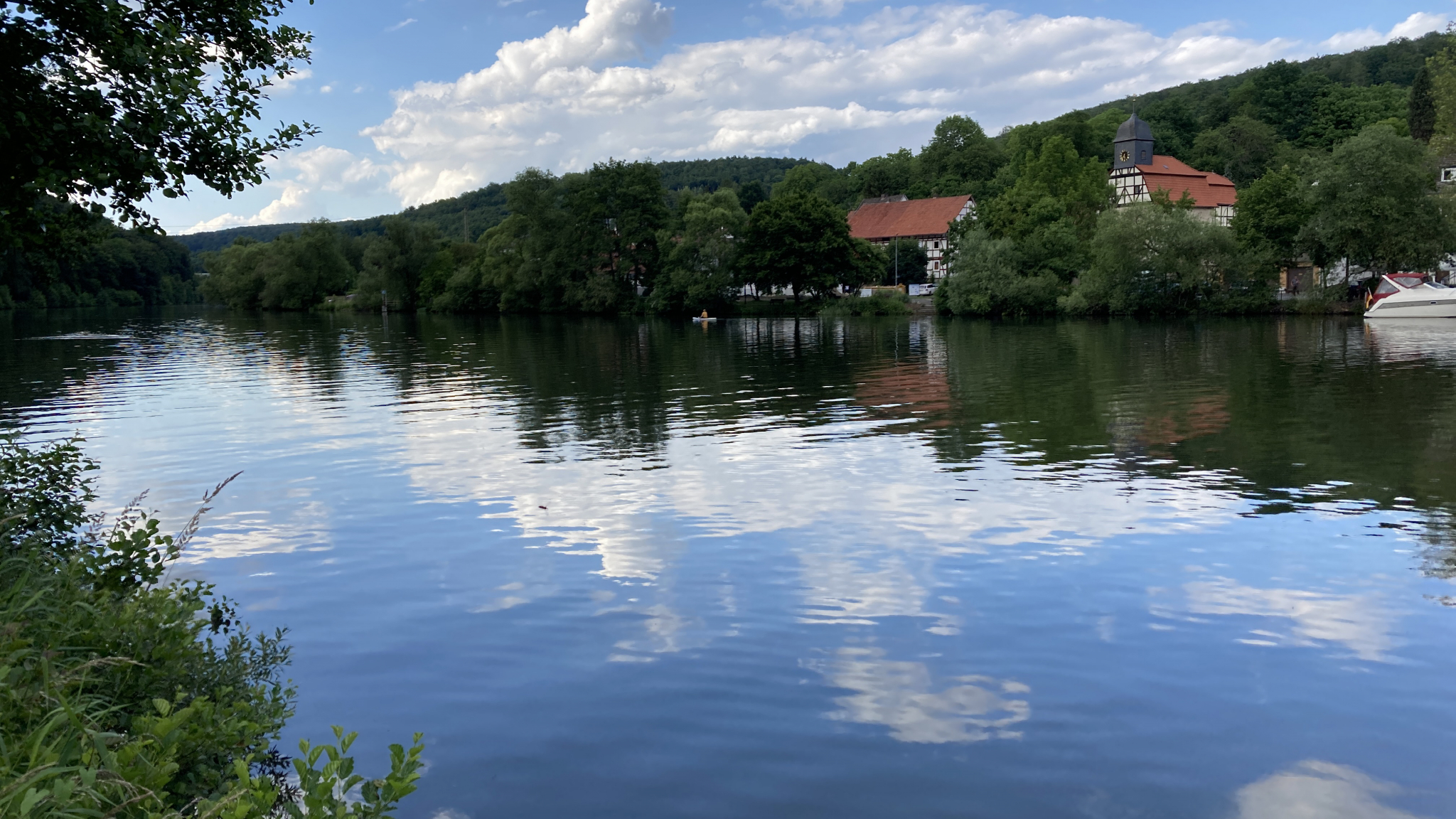 Ein letztes Mal geht es in den Wald, den Berg hinab, wo wir auf der Höhe von Spiekershausen auf die Fulda treffen. Die Stadtgrenze verläuft nun genau in der Mitte des Flusses und wir wollen auf der rechten Seite flussaufwärts in Richtung Stadtzentrum wandern.