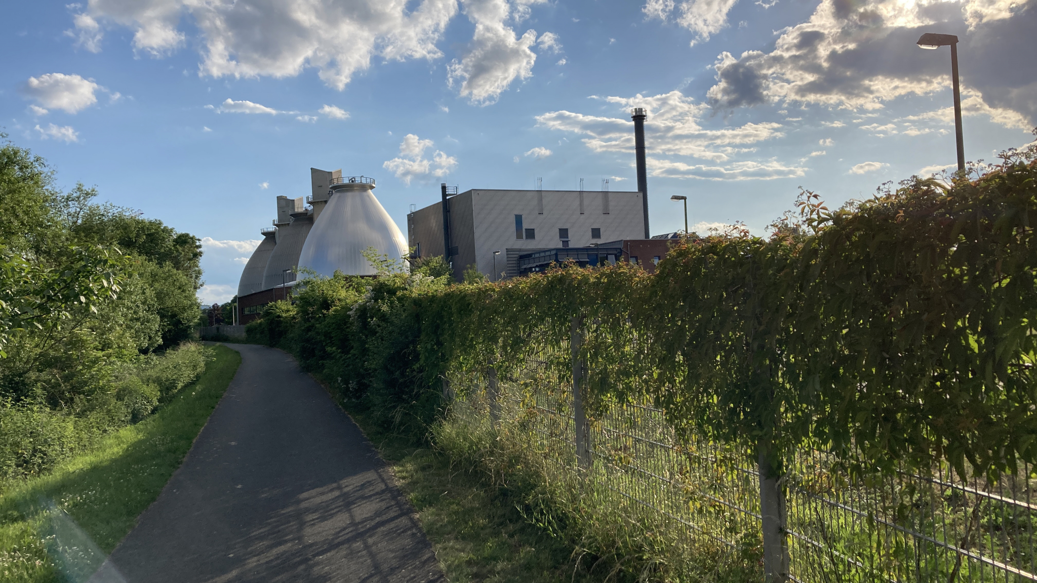 Der Weg durch den Wald endet nördlich von Harleshausen und wir kommen auf offene Felder und dann auf die ersten Anzeichen von Siedlungen als wir auf Vellmar zugehen. Auf der Hamburger Straße passieren wir das Wasserhaus Vellmar, das zur Trinkwasserversorgung von Kassel dient. Dann kommen wir das erste Mal wieder in bewohntes Gebiet bei Vellmar West und am Jungfernkopf. Nach einigen Wegen durch das Wohngebiet und durch Parks kommen wir auf die Schenkebier Stanne, die wir ein Stück entlang gehen, um die Bahnlinie und später die B7 zu unterqueren. Vorbei am Tierheim Wau-Mau-Insel geht es nun durch Industriegebiet bis zur Pariser Mühle, einer Getreidemühle, deren Gelände wir überqueren wollen. Leider sind die Tore geschlossen und somit bleibt uns hier der Übergang über die Ahne verwehrt. Der Umweg über die Hauptstraßen ist nicht schön, aber zum Glück nicht zu lang.