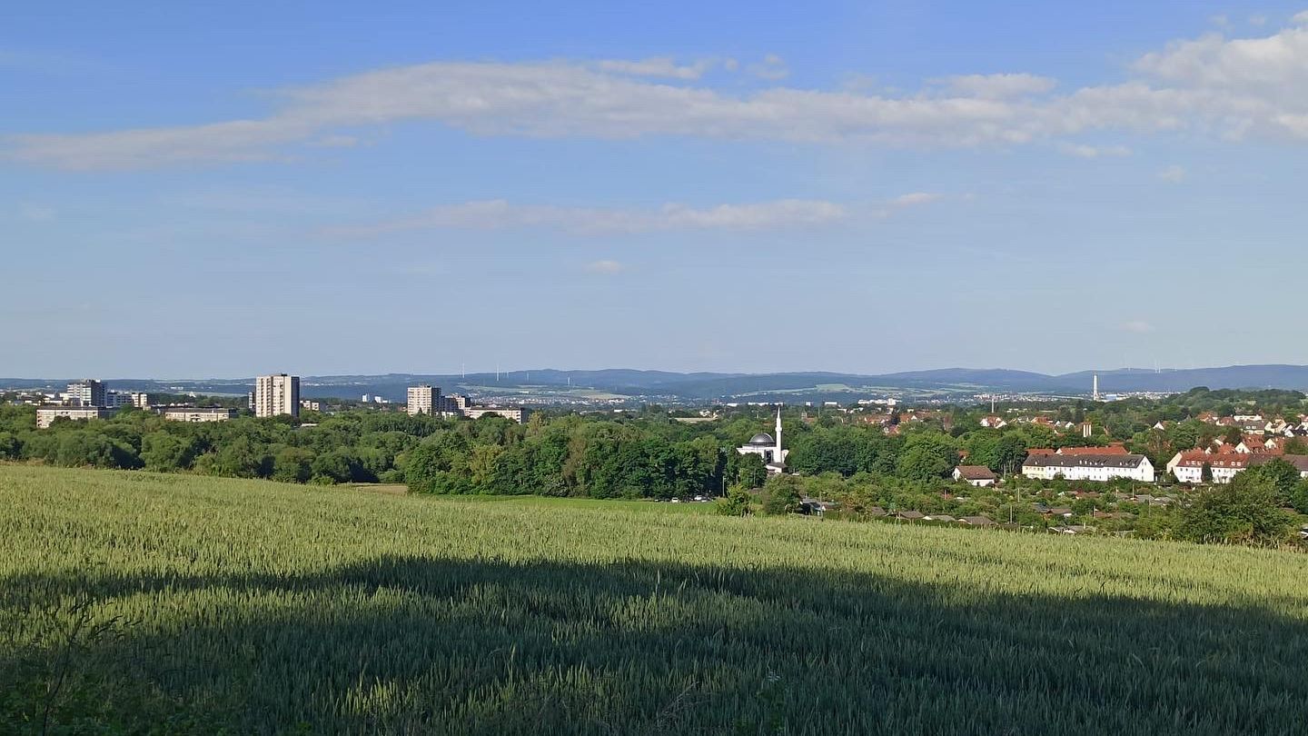 Da mich der Ehrgeiz gepackt hat, lasse ich die Haltestelle aber hinter mir und folge der Tour, die mich erst durch ein Wohnquartier und dann wieder ins Grüne führt. Am Rand von Feldern geht es leicht bergauf und der eine oder andere Blick zurück beschert mir schöne Panorama-Aussichten auf Kassel. So nähere ich mich einer Unterquerung der Autobahn A44, nach der ich das Naturschutzgebiet Baunsberg erreiche. Die Route führt einen Waldweg entlang, aber leider genau neben der Autobahn mit entsprechender Geräuschkulisse, weshalb ich das Wegstück schnell hinter mich bringe.