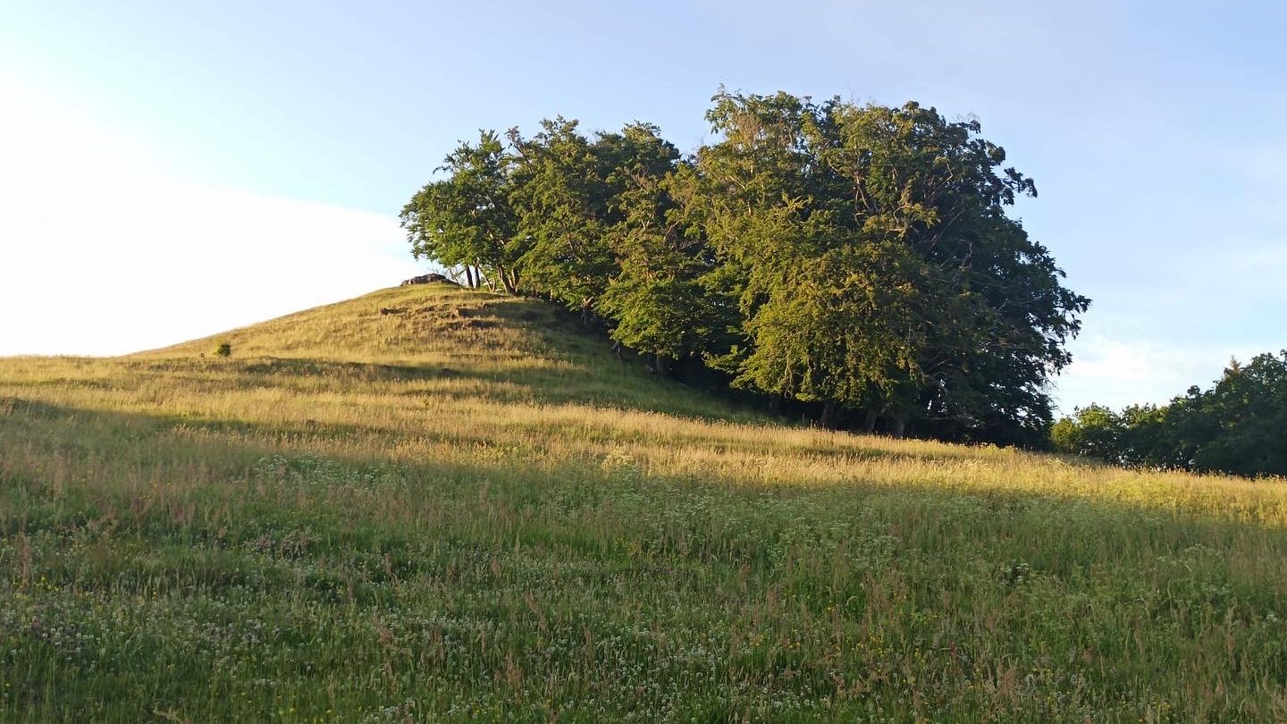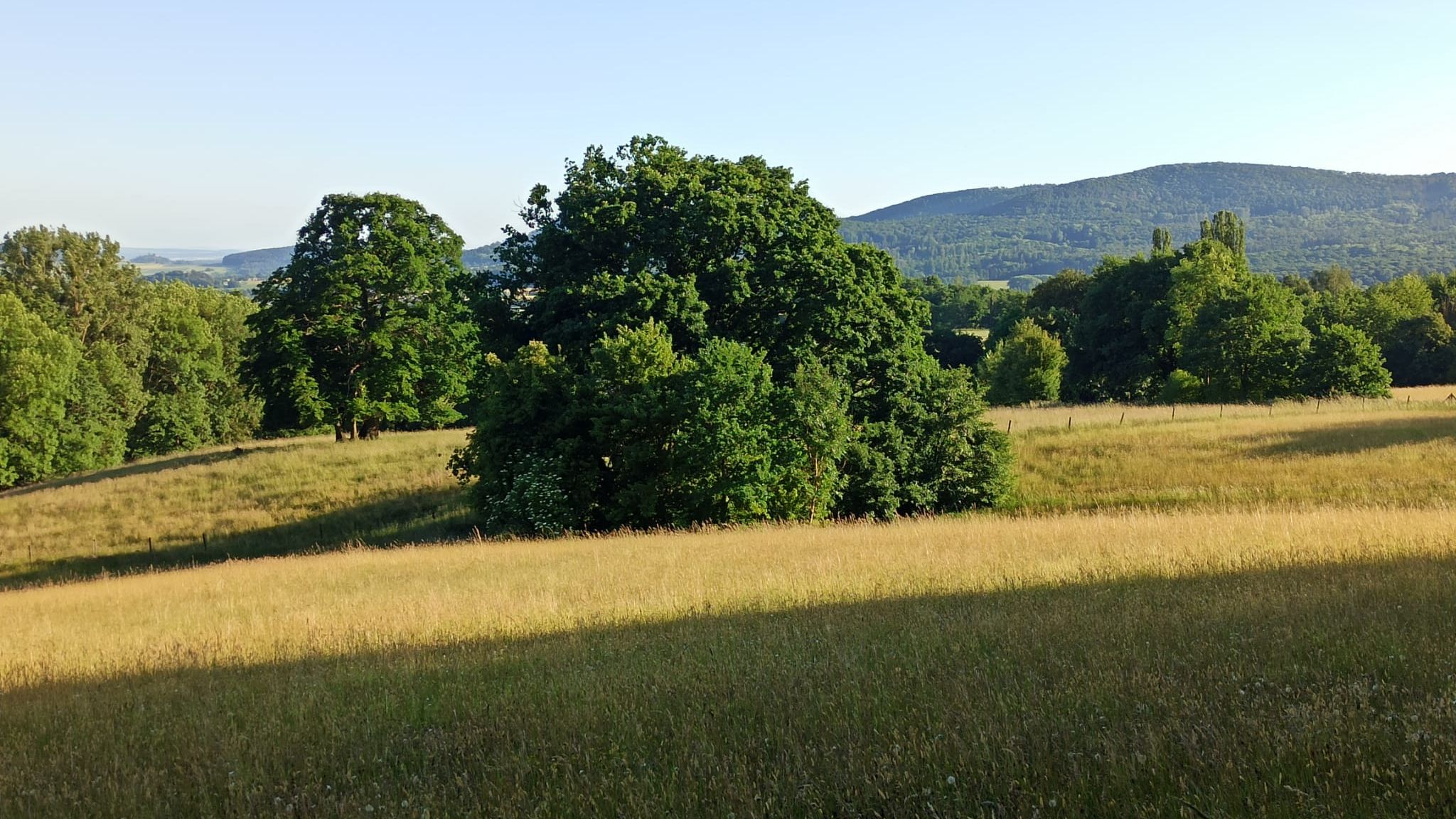 Kaum habe ich die Häuser hinter mir gelassen, geht es im Wald immer deutlicher bergan. Zunächst auf einem gut ausgebauten Forstweg, dann mitten über eine Lichtung bzw. Wiese, bis sich schließlich eine große Weidefläche auftut. Auf dieser begrüßt mich das „Kleine Herbsthaus“, ein teilweise baumbestandenes Hügelchen, welches sich im Abendlicht von seiner besten Seite zeigt.