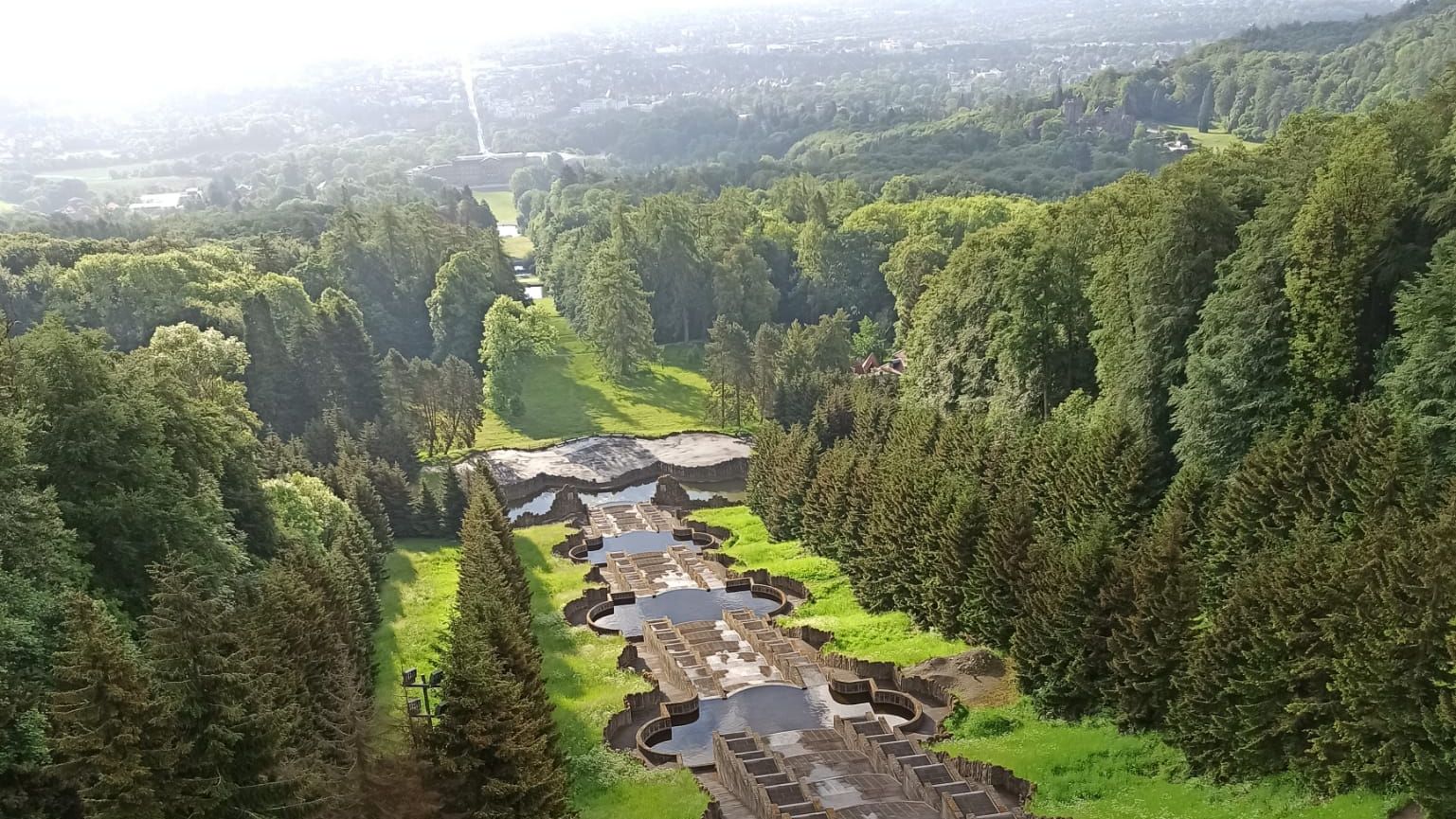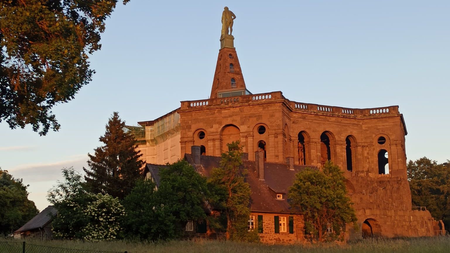 Zurück auf der Straße ist es nicht mehr weit bis zu den Parkplätzen hinter dem Herkules. Kurz vor Sonnenuntergang bin ich da und bekomme dessen „Kehrseite“ - von der untergehenden Sonne in schönstes Licht gesetzt – präsentiert. Am Fuße des Oktogon gestatte ich mir nun doch eine wohlverdiente und überfällige Pause und genieße mit dem Sonnenuntergang im Rücken den Blick hinunter nach Kassel. Dass es nun schnell dunkel wird, ist nicht schlimm, denn der Weg durch den Bergpark ist gut ausgebaut und es geht (ua wieder vorbei an den Kaskaden, der Teufelsbrücke, dem Gewächshaus und Schloss Wilhelmshöhe) ab jetzt ohnehin in raschem Schritt nur noch bergab.