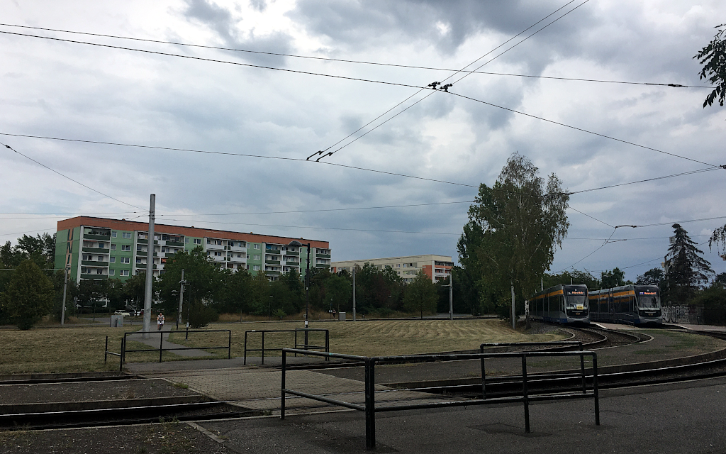 Ich halte mich hier nicht auf, hoffe ich doch noch, in den kommenden Dörfern ein Abendessen zu bekommen. Doch leider biegt der Weg kurz in die Hallesche Straße ein - hier fährt wieder Straßenbahn - und führt dann wieder weg von den Siedlungen in das Niemansland des Leipziger Nordens.