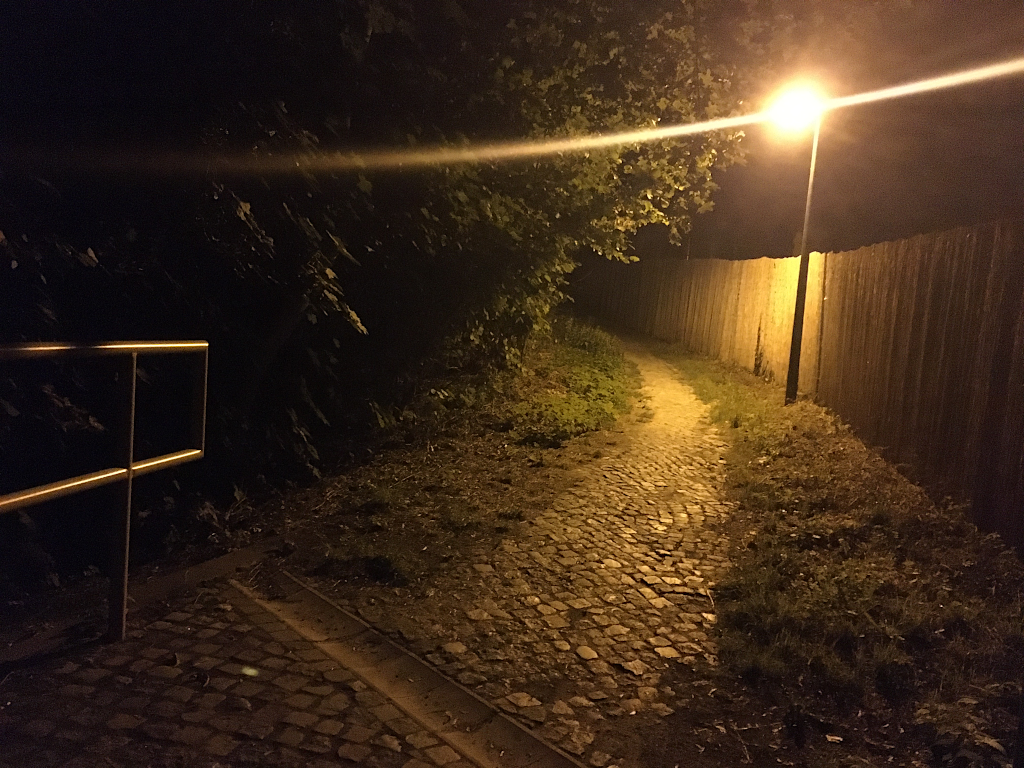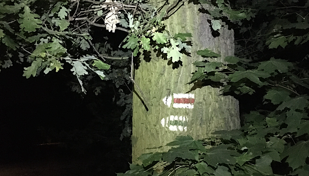 Zusammengefasst: Es ist nach Mitternacht, ich bin hundemüde, die Füße tun weh, so dass zügiges Ausschreiten nicht mehr möglich ist, und es ist noch übel weit. Tatsächlich komme ich seit einigen Kilometern nur noch sehr langsam voran und habe meinen ursprünglichen Zeitplan jetzt schon deutlich gerissen.
