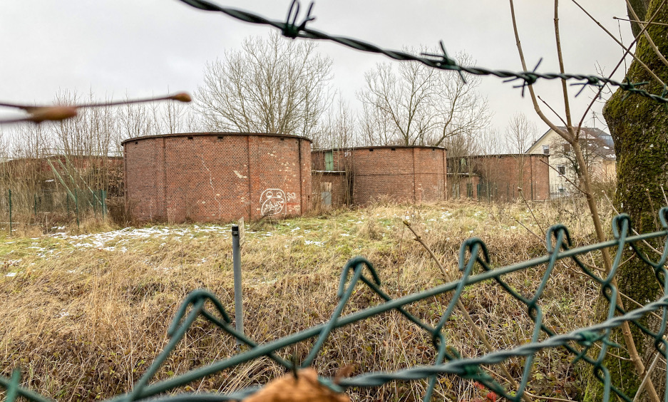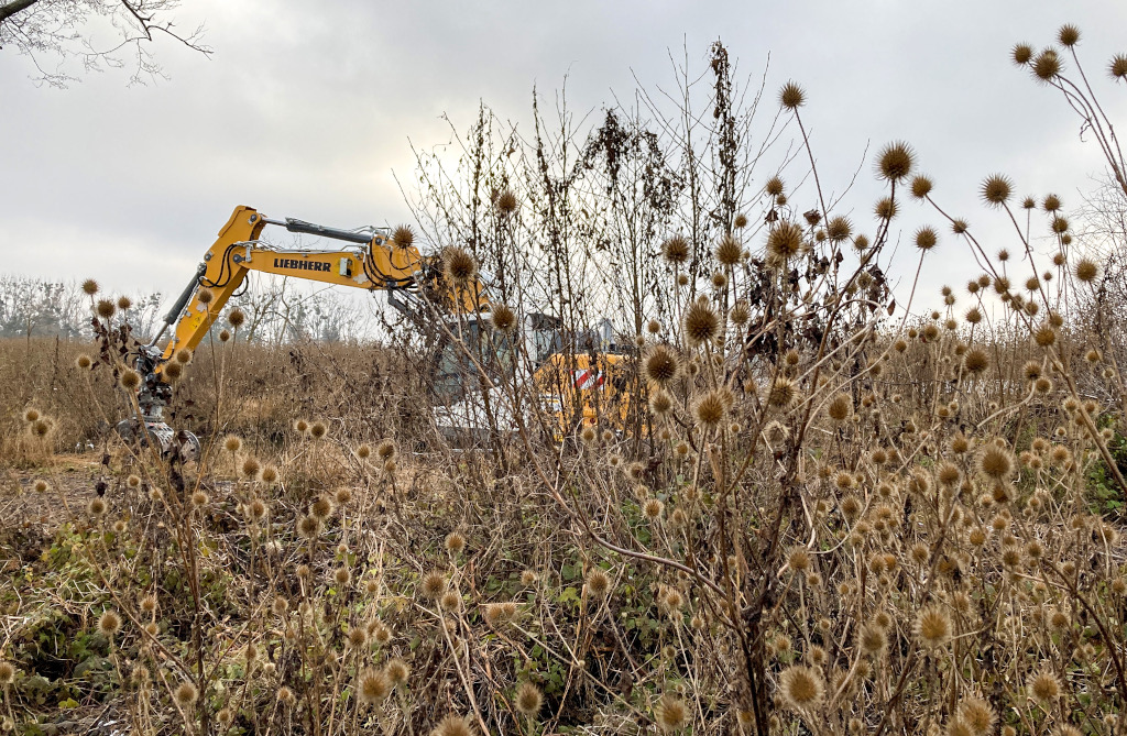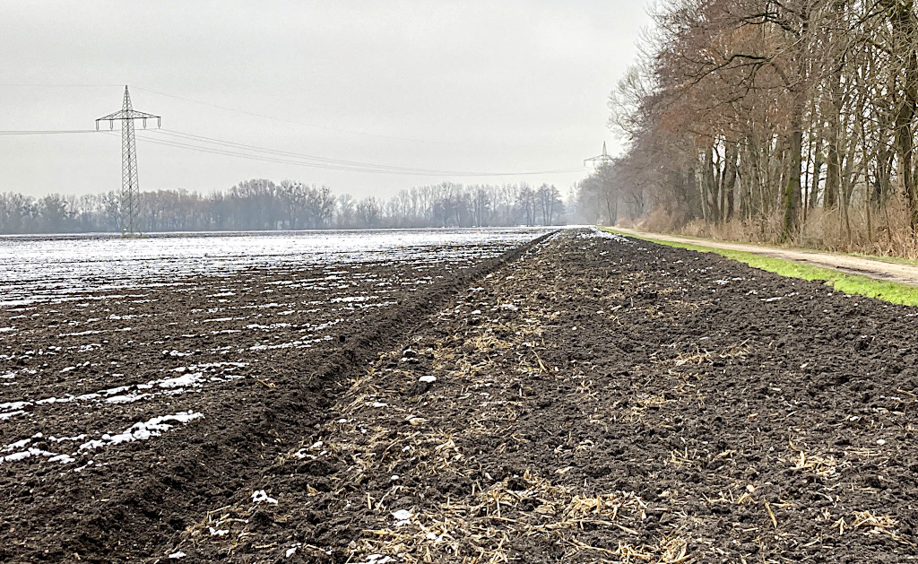 Ehemalige Kläranlage Endlich wieder weites Land, auf den Feldern liegt deutlich mehr Schnee. Rechts der Kanal und tatsächlich steht dort ein verlassener Bagger mitten im Wasser und rostet vor sich hin. Der Weg geht nun etwas weiter westlich, den Kaltererbach entlang. Auf dem offenen Feld sind trotz fortgeschrittener Stunde noch Rehe unterwegs. Sie haben mich bemerkt und ergreifen schnell die Flucht.