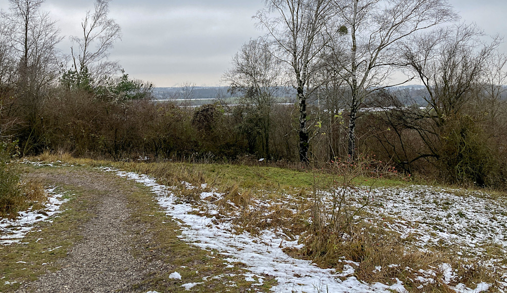 Der Weg ist zwar asphaltiert, aber das muss schon vor sehr langer Zeit passiert sein. Die Natur hat inzwischen gezeigt, dass sie sich ihr Eigentum zurück holen kann. Links und rechts des Weges steht dichtes Unterholz, an einem Abzweig erhascht man einen Blick auf eine Birkenallee, die von der tief stehenden Wintersonne angestrahlt wird. Von dort geht es am Flughafengelände weiter an einen wunderschönen Feldrain. Interessant sind auch die Birkenwäldchen, die sich hier immer wieder mit Hecken oder Wiesen abwechseln.
