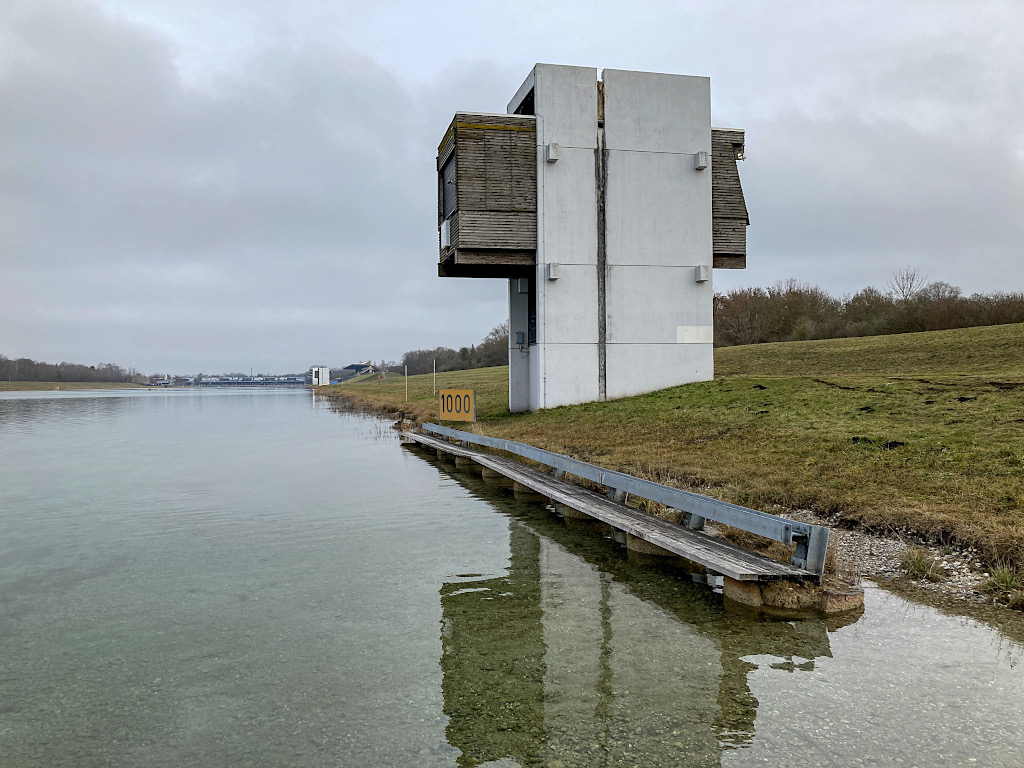 Ausblick über das Schwarzhölzl Nach einer Abzweigung nach links führt mich ein Asphaltweg zur ehemaligen Olympia Regattastrecke. Man könnte hier abkürzen, aber da die Stadtgrenze quer durch das Becken verläuft, gilt es dieses halb zu umrunden. Zwei Veteranen ziehen in Sportbooten langsam an mir vorbei, ansonsten ist die gesamte Anlage menschenleer. Man kann sich gar nicht mehr vorstellen, dass hier 1972 Wettkämpfe im Rahmen der Olympischen Spielen ausgetragen worden sind.