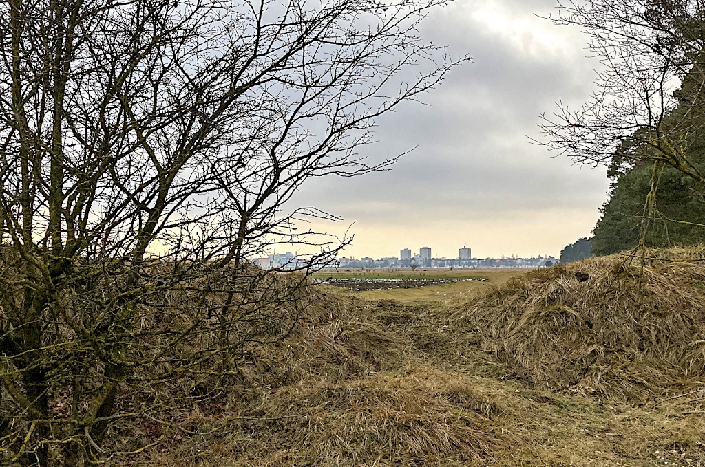 Man kann hier wieder Dammwege benutzen, die ab und zu einen sehr schönen Ausblick über die Landschaft bieten. Leider mäandert sich der Weg durch die Heidelandschaft, um doch nochmal die Stadtgrenze zu erreichen. Nach 25 km Wandern stellt mich das doch noch einmal auf die Probe - besonders wenn das Ziel so nah scheint.