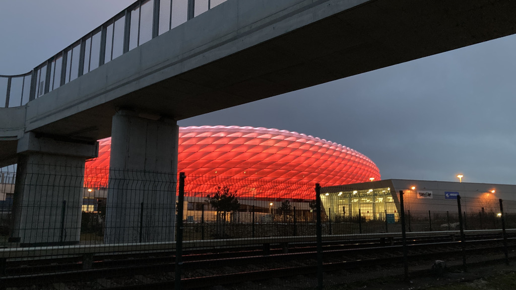Dafür hat mich die Extra-Einlage in die Abenddämmerung gebracht und die Allianz-Arena strahlt mir in schönstem Rot entgegen. Leider ist auch sie in dieser Zeit leer - Fußball wird nach wie vor ohne Publikum gespielt.