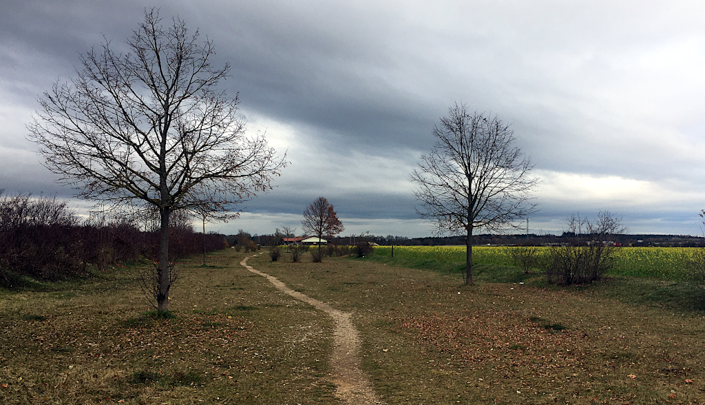 Die Dämmerung bricht herein, aber ich denke, das letzte Stück schaffe ich jetzt auch noch. Weiter geht es auf der rechten Seite der Autobahn entlang in Richtung Osten, noch einmal über Felder bis ich das Ziel meiner heutigen Wanderung erreiche: Die S-Bahnstation Karlsfeld.