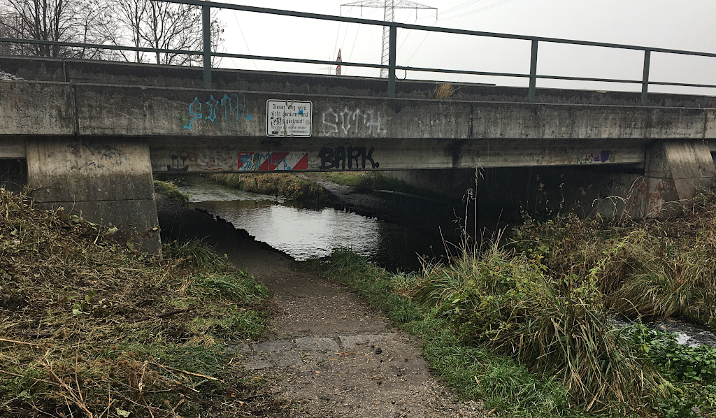 Bei Puchheim wandere ich am Ortsrand entlang. Die Querung einer S-Bahn-Linie ist etwas abenteuerlich, hat der Fußweg, der zusammen mit dem Bach unter der Bahn-Brücke entlang läuft nur eine Höhe von nur 1,50m. Der Bach hier heißt Gröbenbach und auf seiner linken Seite verläuft ein sehr schöner Fußweg. Plötzlich merke ich dass ich nach rechts abbiegen muss. Aber leider bin ich auf der falschen Seite des Baches und weit und breit ist keine Brücke zu sehen. Ich befürchte schon, dass ich zurück zur Straße muss um mir einen Weg auf der anderen Bachseite zu suchen. Doch ein Stück geradeaus entdecke ich eine Planke, die jemand über den Bach gelegt hat. Er oder sie hat wahrscheinlich das gleiche Problem gehabt und hier eine Lösung geschaffen.