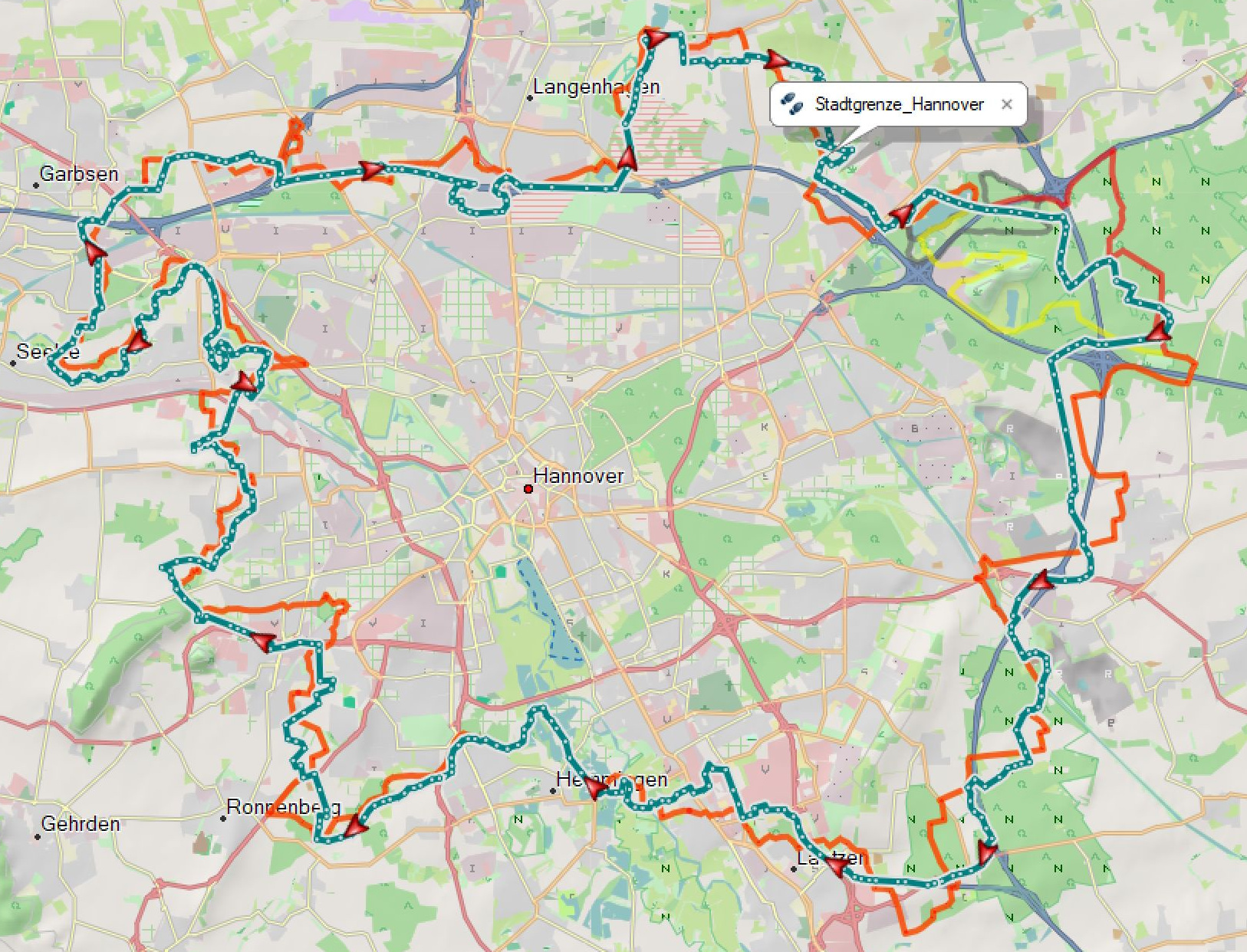 Hannover - Stadgrenze und WanderwegNachdem das vollbracht ist, kann ein guter Autorouter einen durchgehenden Weg um die Stadt finden. Auf dieser Route kann es jetzt los gehen.