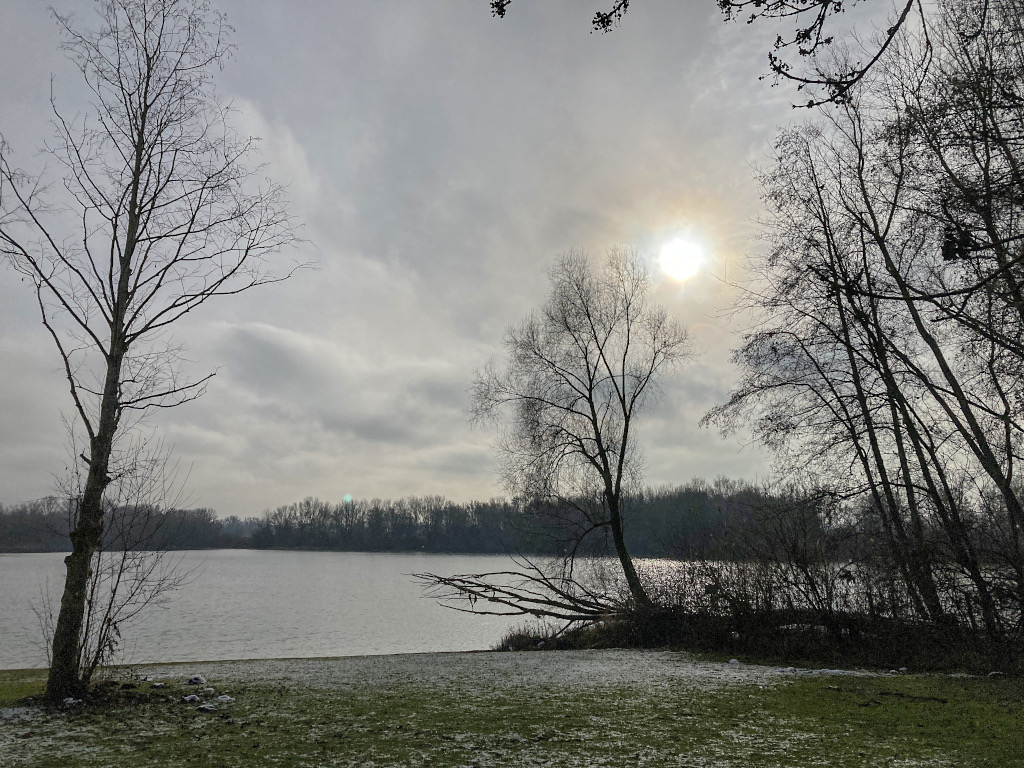 Gleich dahinter befindet sich der Regattapark-See - ein hübsches Plätzchen mit Bänken und Liegewiesen, wo ich mir im Sommer durchaus regen Betrieb vorstellen kann. Heute sind auch hier nur ein paar Jogger unterwegs. Die Sonne hat es endlich geschafft, durch die Wolkendecke hindurchzukommen, und stellt den See in ein traumhaftes Licht.