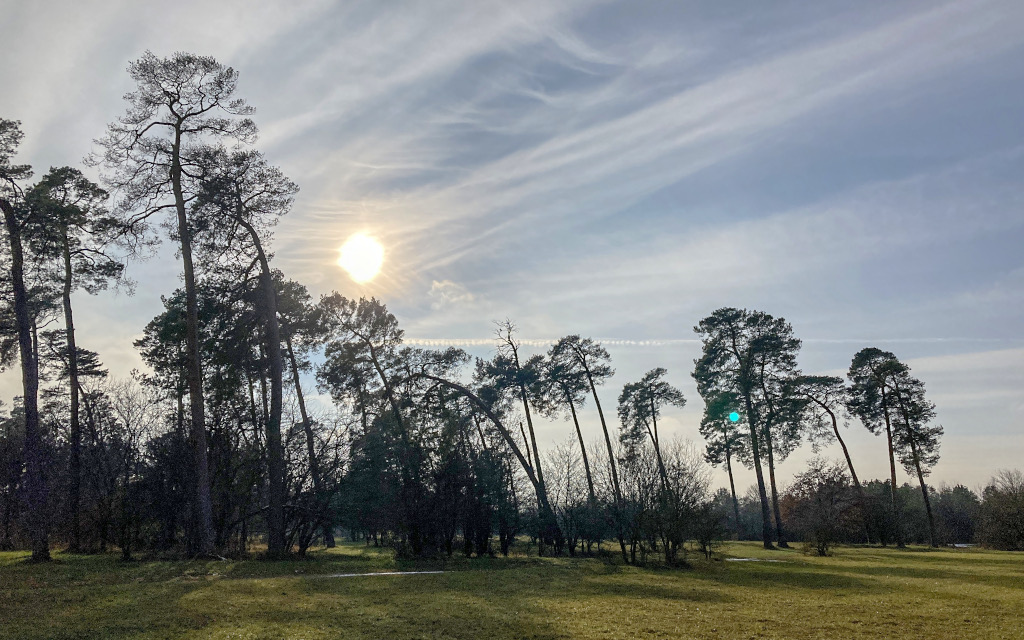 Danach endlich wieder Wald, unterbrochen von offenen Wiesen. An einer Stelle stehen hohe Kiefern, die sich durch den Wind gebeugt worden sind. So etwas hätte ich hier nicht erwartet. Weiter geht es dann hinter dem Wohngebiet Hasenbergl entlang.