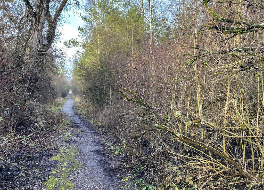 Der Weg ist zwar asphaltiert, aber das muss schon vor sehr langer Zeit passiert sein. Die Natur hat inzwischen gezeigt, dass sie sich ihr Eigentum zurück holen kann. Links und rechts des Weges steht dichtes Unterholz, an einem Abzweig erhascht man einen Blick auf eine Birkenallee, die von der tief stehenden Wintersonne angestrahlt wird. Von dort geht es am Flughafengelände weiter an einen wunderschönen Feldrain. Interessant sind auch die Birkenwäldchen, die sich hier immer wieder mit Hecken oder Wiesen abwechseln.