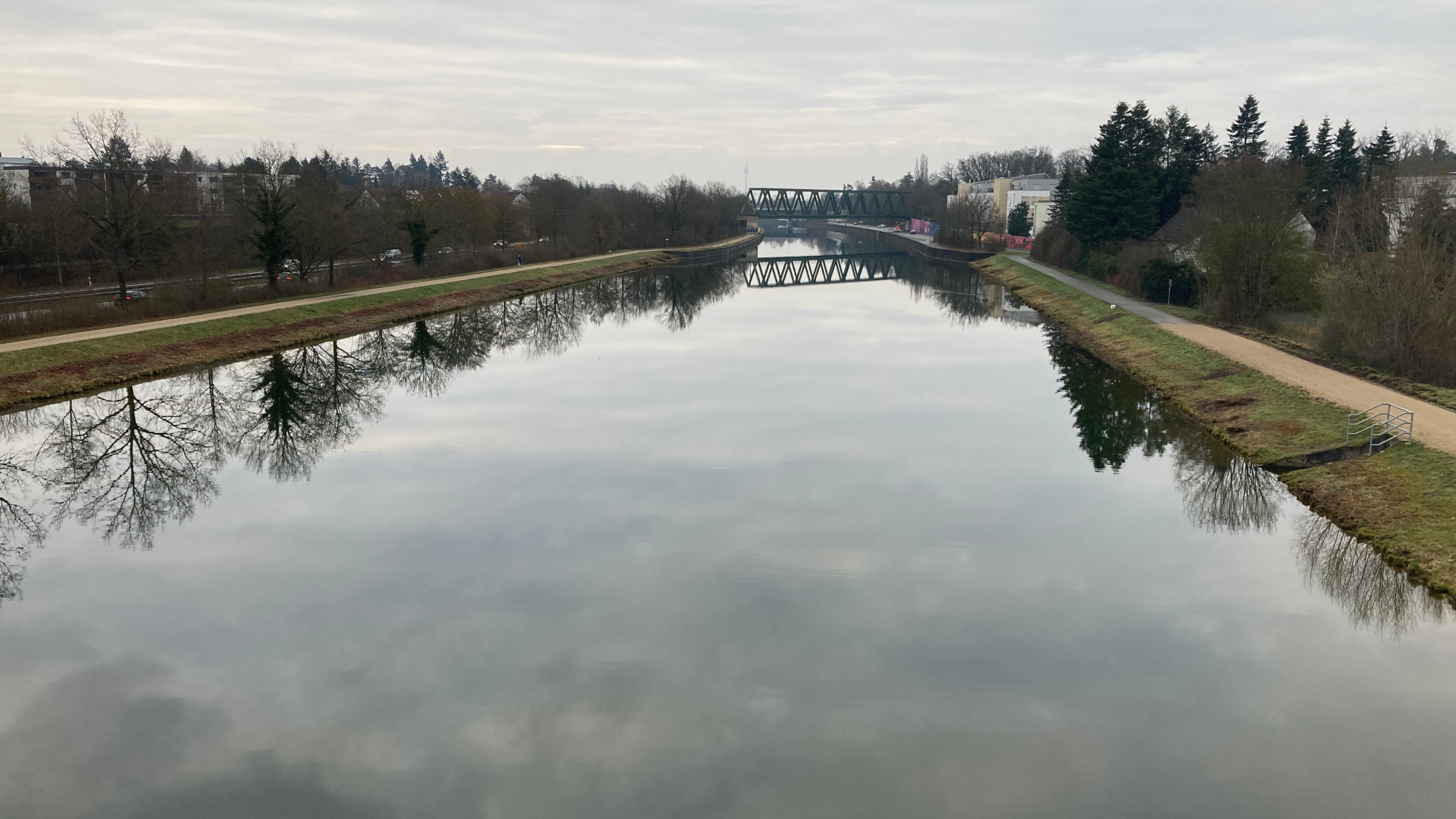 Die erste Etappe der Nürnberg Umrundung haben Claudia und ich im März 2023 gemacht. Es war ein grauer Montag und wir kamen früh um sieben mit der S-Bahn in Fürth Dambach an. Von dort hatten wir es nicht mehr weit bis zur Stadtgrenze und bis zum Beginn unserer geplanten Tagestour. Diese startet am Main-Donau-Kanal, dort wo die Stadt Nürnberg endet und der Stadtrand von Fürth beginnt. Die Gegend ist geprägt von Wohngebieten, Parks und Sportanlagen. Einige tragen die Namen von Firmen, die es heute nicht mehr gibt, aber die maßgeblich für die Entwicklung der Stadt waren, unter anderem „SG Quelle Fürth“ oder „Max Grundig Park“.